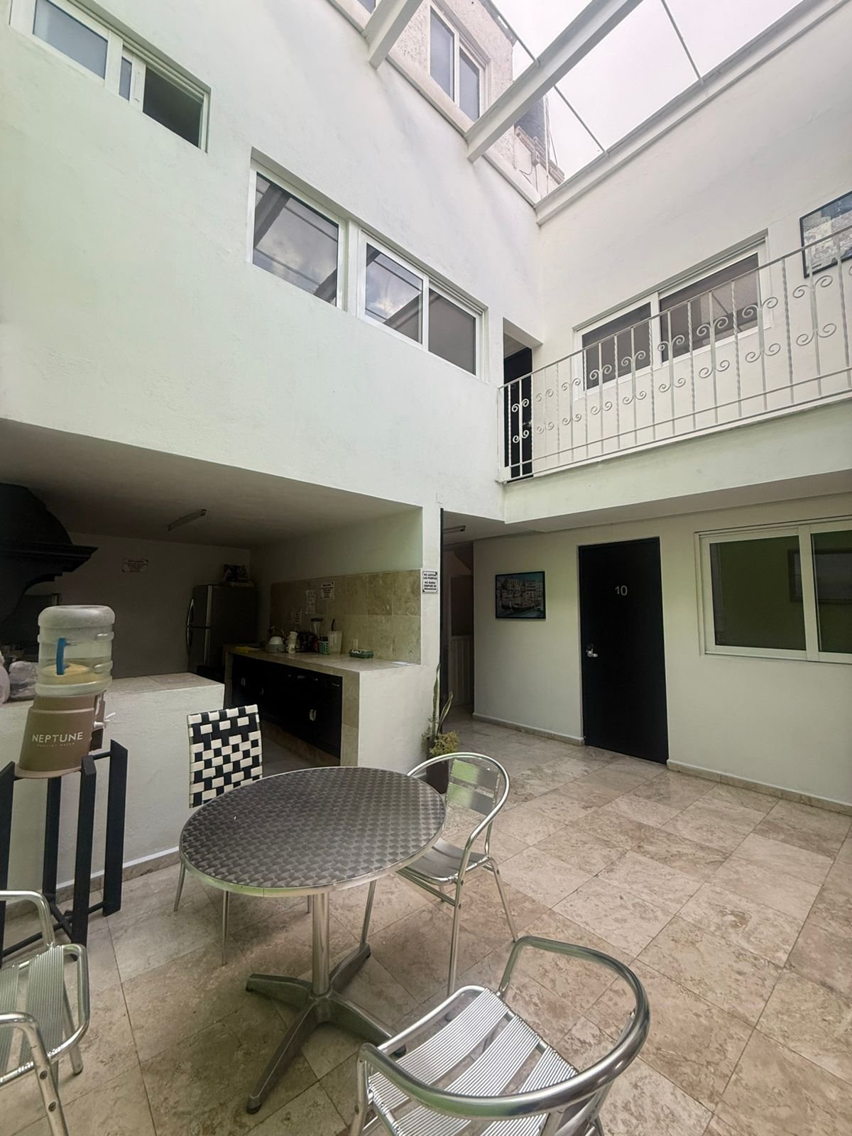 Incluye cama matrimonial, baño, closet, agua caliente, refrigerador, cafetera, microondas, luz, internet, limpieza una vez a la semana, seguridad las 24 horas. El área común consta de zona de cocina, comedor y jardín.